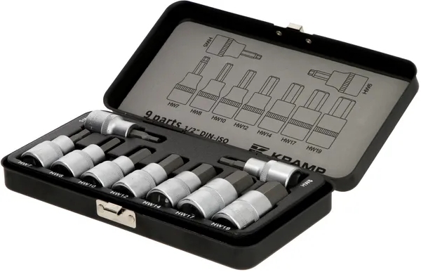 1/2" sešstūra uzgaļu ligzdas: 5, 6, 7, 8, 10, 12, 14, 17, 19 mm