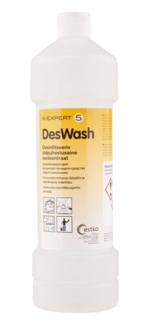 EXPERT 5 - DesWash- Vāji sārmains mazgāšanas-dezinfekcijas līdzeklis izmantojams virsmu mazgāšanai baseinos, pirtīs, saunās, sporta iestādēs, sanitārās telpās, ģērbtuvēs, sabiedriskās un medicīniskās iestādēs, mazgāšanas inventāra (birstes, lupatas u.c.) mazgāšanai. Šis līdzeklis ir saudzīgas pret visu veidu ūdensizturīgām virsmām, labi novērš nepatīkamas smakas, iznīcina baktērijas, rauga un pelējuma sēnīti. Mikrobioloģiski pārbaudīts. Darba šķīduma pagatavošana - 200 ml/10 l ūdens