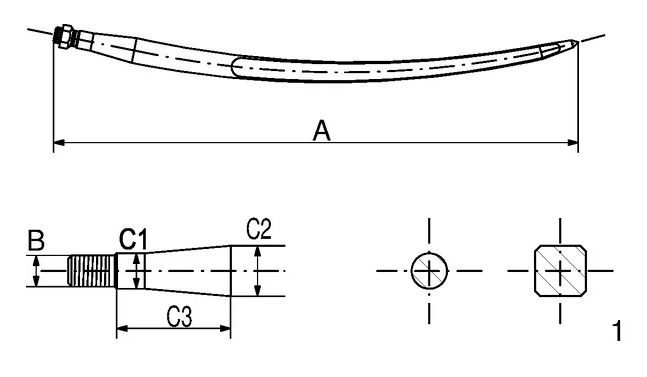 FT45 Iekrāvēja zars, izliekts, kvadrātveida sekcija 37x600mm, smails uzgalis ar M20x1.5mm uzgriezni,