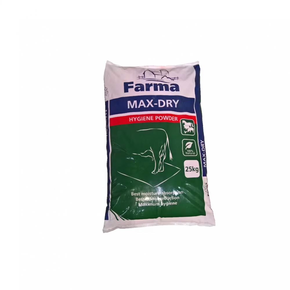 Max-dry ir lietošanai gatavs sausais higiēnas pulveris;līdzeklis higiēnas apstākļu uzlabošanai lopkopības ēkās, kurās tiek turēti liellopi, cūkas, aitas, zirgi, mājputni un kažokzvēri. Paredzēts dzīvnieku dzīves telpas sausināšanai un patogēno baktēriju attīstības samazināšanai.