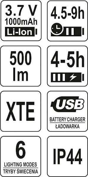 Ļoti viegls un funkcionāls Yato priekšējais lukturis ar maksimālo jaudu 500lm un darbības rādiusu 70m. Seši darbības režīmi ļauj pielāgot apgaismojumu veiktajām darbībām un akumulatora uzlādes līmenim. Elastīgā siksna nodrošina labu piegulšanos galvai. Sarkanā, mirgojošā gaismas diode pakausī nodrošina drošību, piemēram, skrienot vai strādājot tumsā. Aprīkots ar 3,7V 1000mAh litija jonu akumulatoru, tas nodrošinās līdz 10 stundām darbību